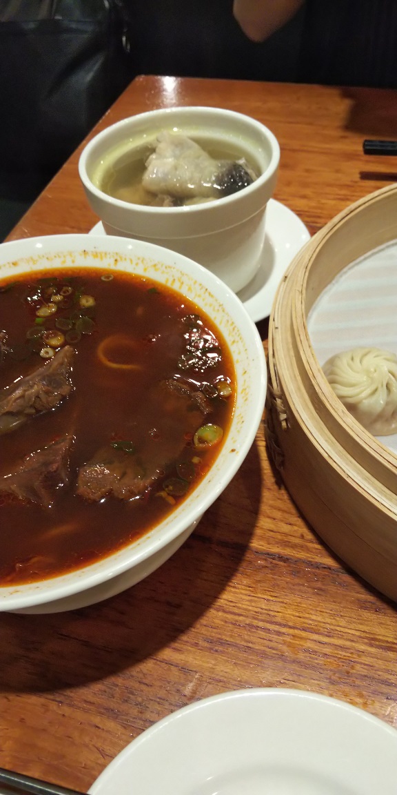 肉そばと鳥のスープと小籠包。このあと別な味の小籠包2つと空心菜の炒め物が届く。くいまくり。向かいは撮影に忙しいうちの奥さん(ああ僕も撮ってるか)